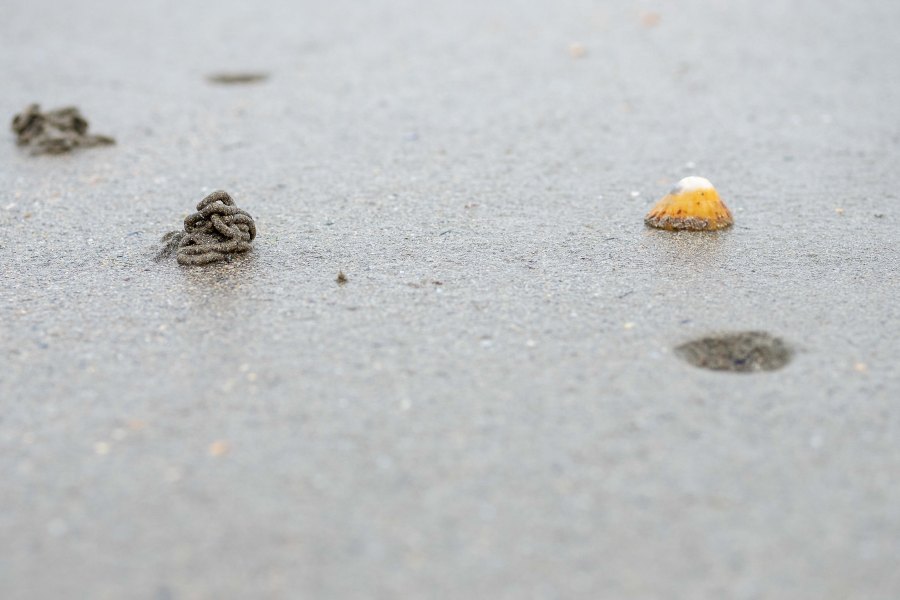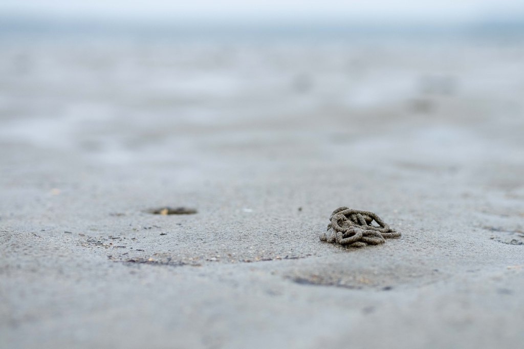 Was man bei Ebbe an den Stränden zu Hauf sehen kann sind kleine Löcher im Sand und ebenso zahlreich kleine Häufchen Sand in Würstchenform in unmittelbarer Nähe dazu. Und das kommt nicht von ungefähr, denn der Wattwurm als solcher ist nun mal ein Wurm – mit einem vorderen Ende, damit konsumiert er Sand in für seine Größe rauen Mengen – und einem hinteren Ende, da drückt er diesen Sand wieder raus.