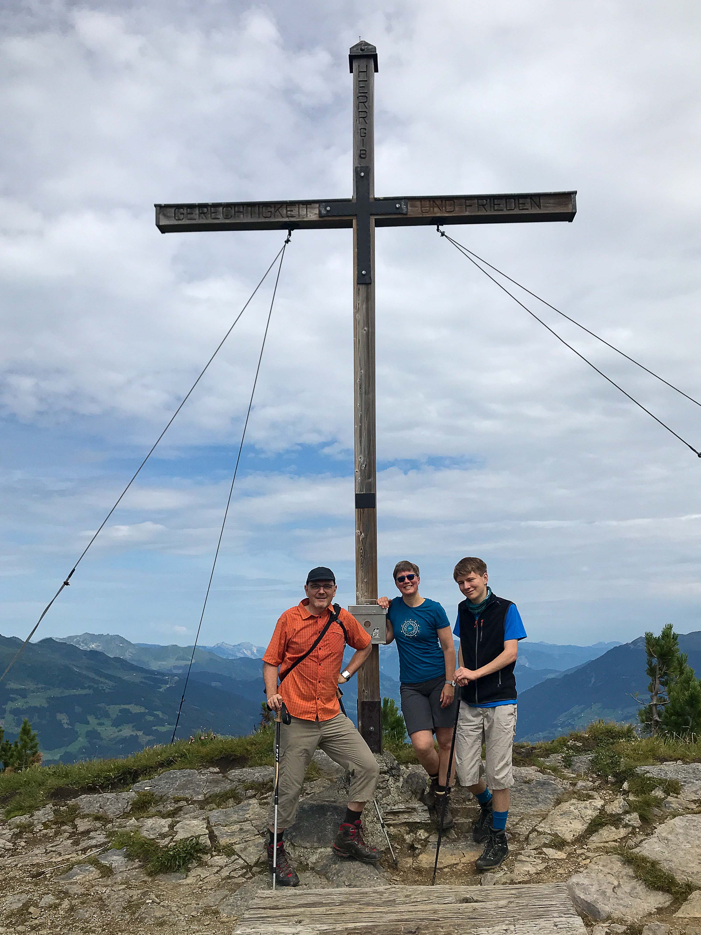 Aber die Mühe hat sich gelohnt! Am Kreuz oben gibt’s das obligatorische Bild und eine Wahnsinnsaussicht ins Tal.