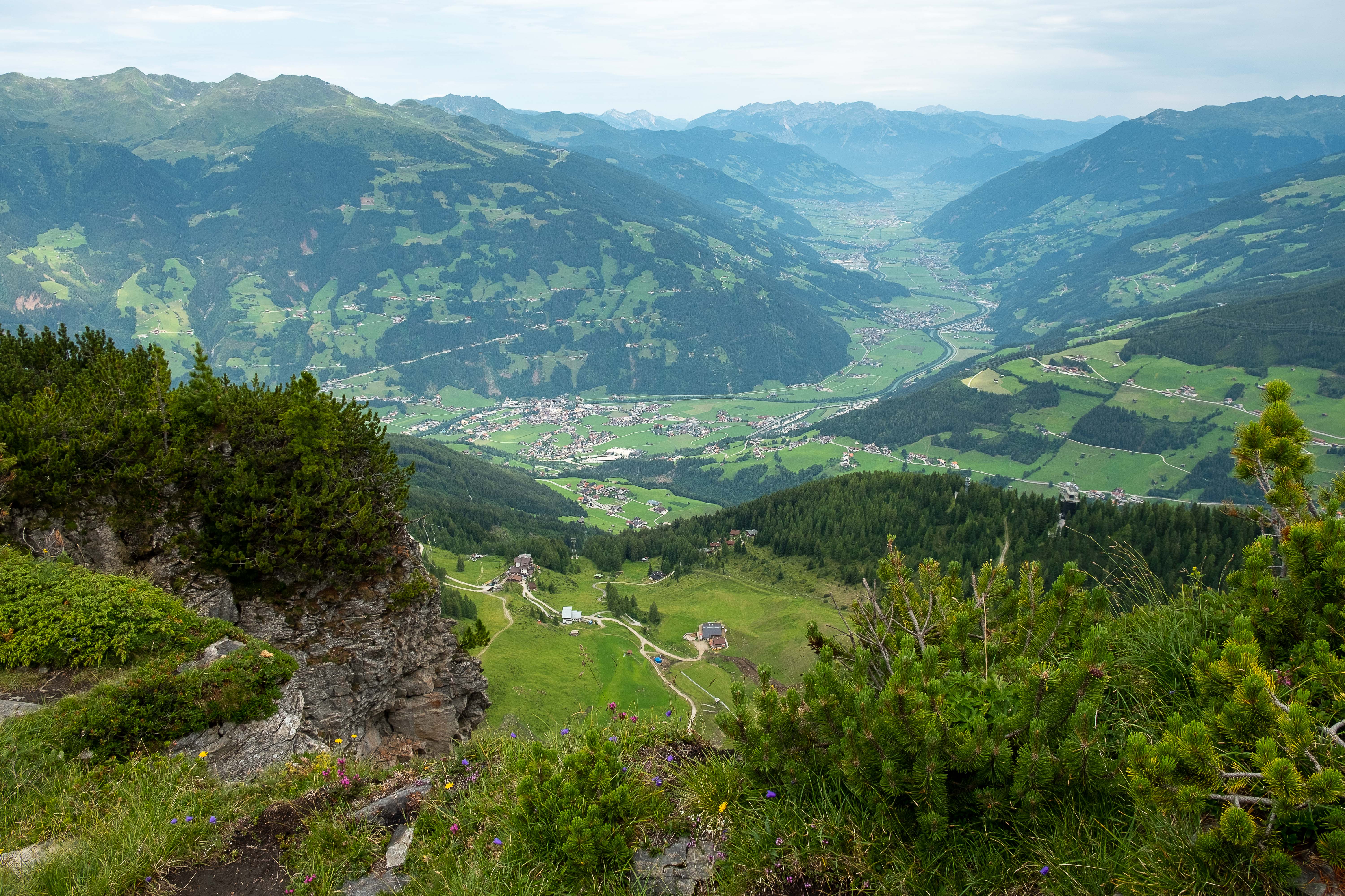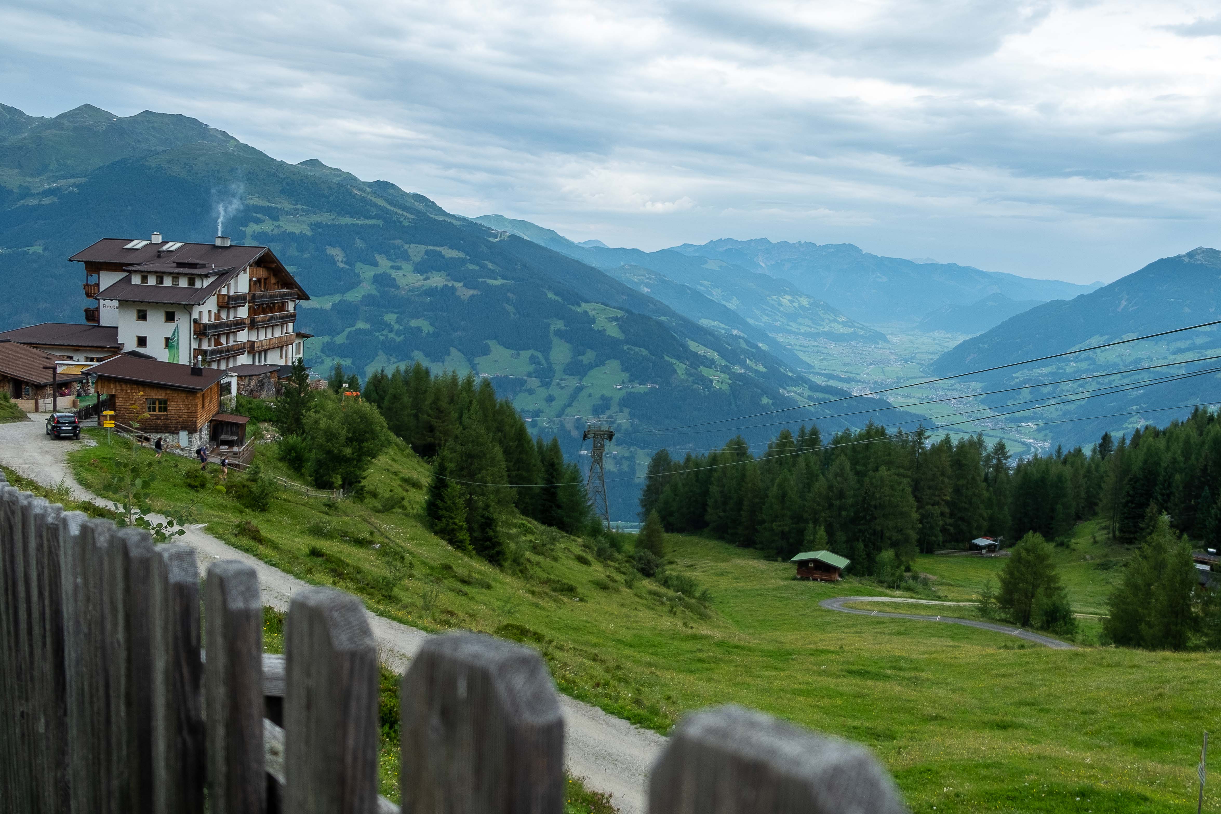 Der Blick ins Tal zeigt unser Ziel – die Gerlosstein-Alm. Hier lechzen wir einem Radler und dem ersten Kaierschmarrn des Sommers entgegen!