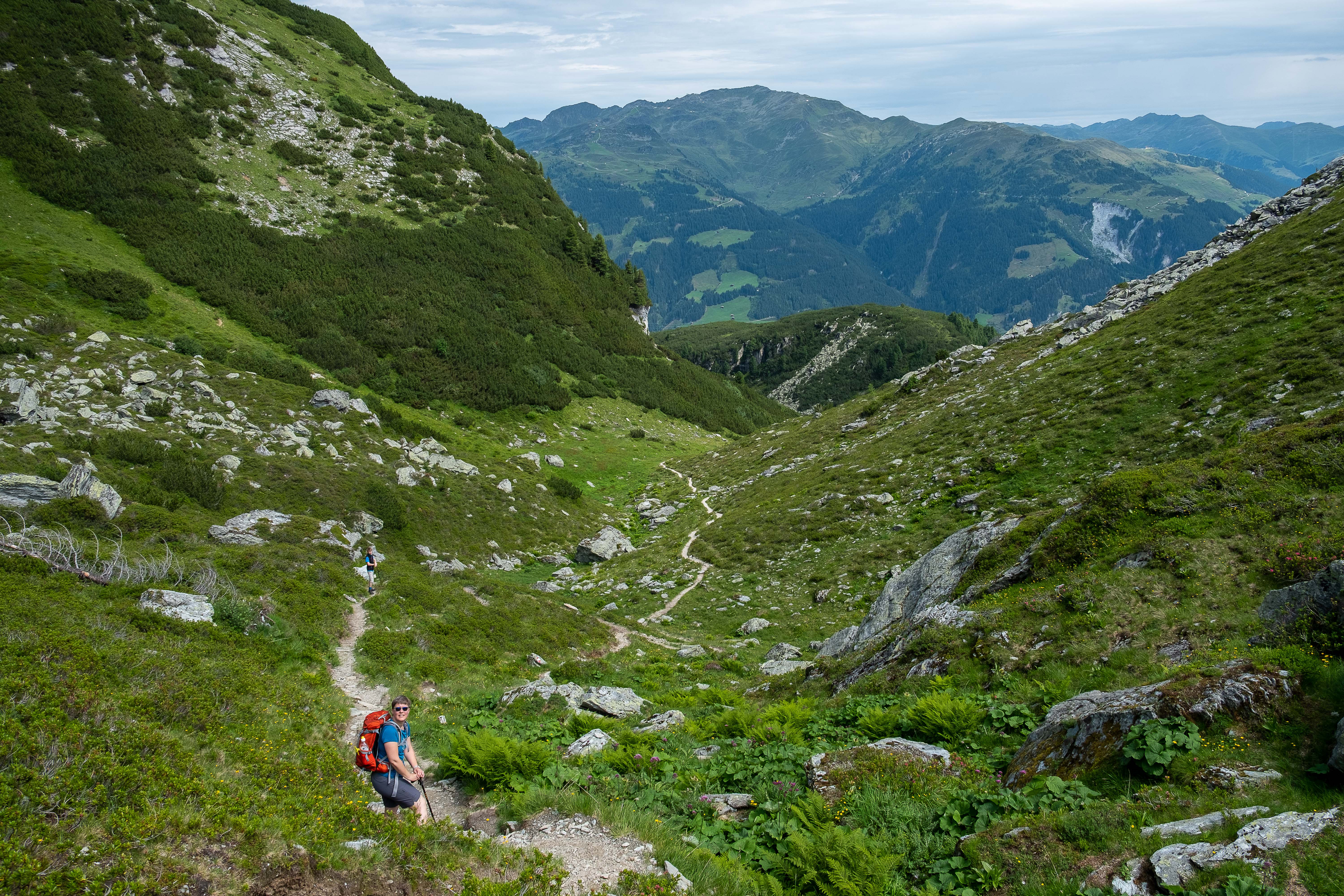 Der Abstieg führt über den Rücken der Gerlosteinwand über ein Kar zum Heimjöchl.