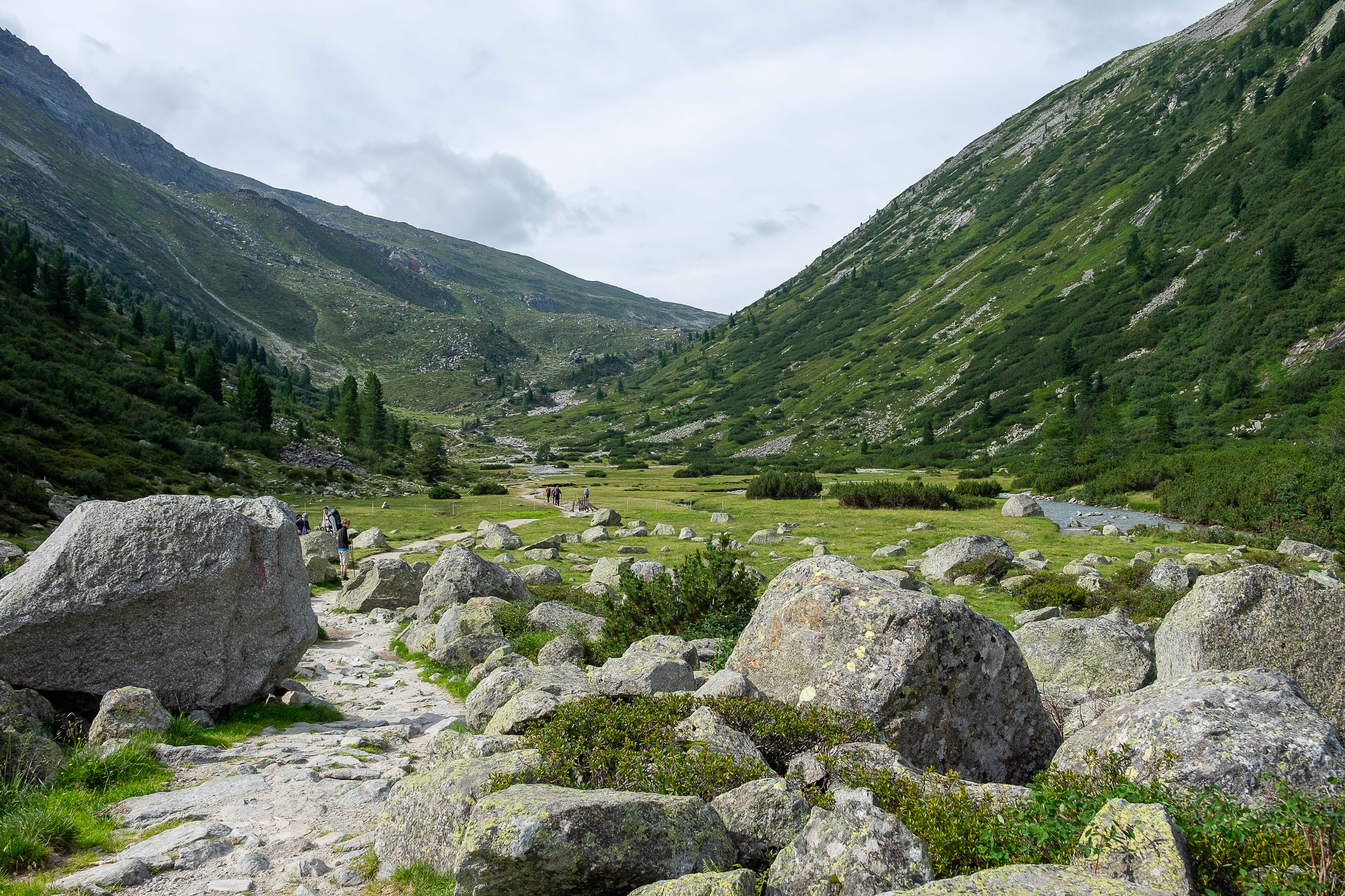 Also, der Reihe nach. Wir schaffen, es um 9:15 Uhr am Schlegeisspeichersee am Parkplatz zu sein. Das war nicht ganz einfach, denn dafür mussten wir ungefähr eine Stunde zuvor uns Domizil verlassen. Und schließlich haben wir Urlaub! Aber egal. Der Weg in den Zamser Grund erweist sich als prima Warmlaufstrecke – echt schön das Tal und von mäßigem Anstieg. Daher ist es auch bei Mountainbikern sehr beliebt.