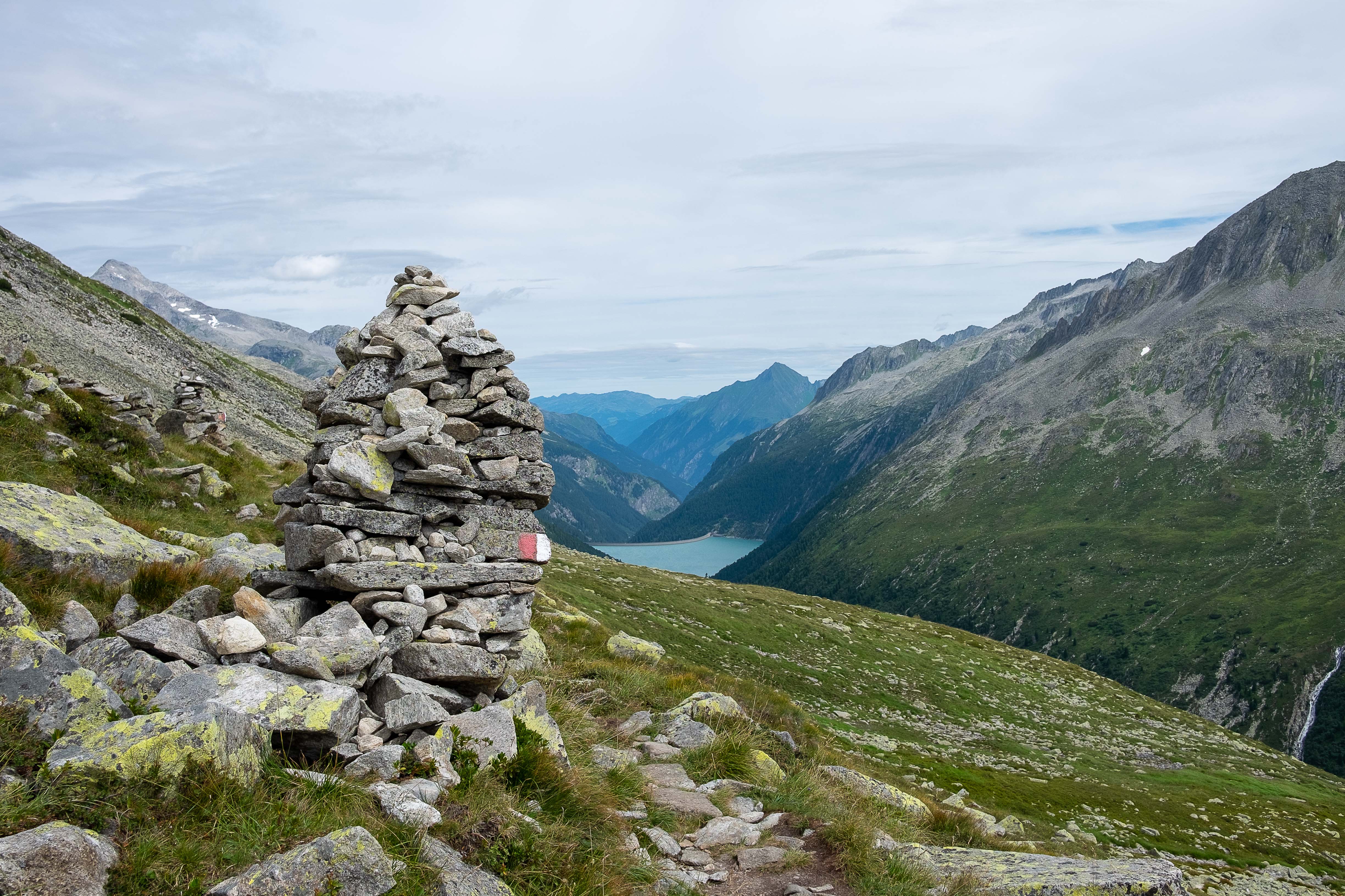 Die Stoan-Mandl weisen den Weg und ab und zu spitzelt der Speichersee hervor, dem wir stetig näher kommen.