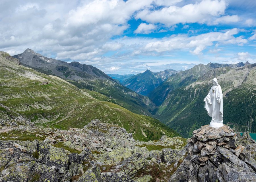 Der Weg zur Olperer Hütte zieht sich. Hinter jeder Kehre erwarten wir den ersten Blick auf die ersehnte Hütte. Doch was wir nicht erwarten ist diese Madonna, die auf einmal hoch erhaben über dem Weg ihren Segen gibt – siehe auch unser heutiges Titelbild.