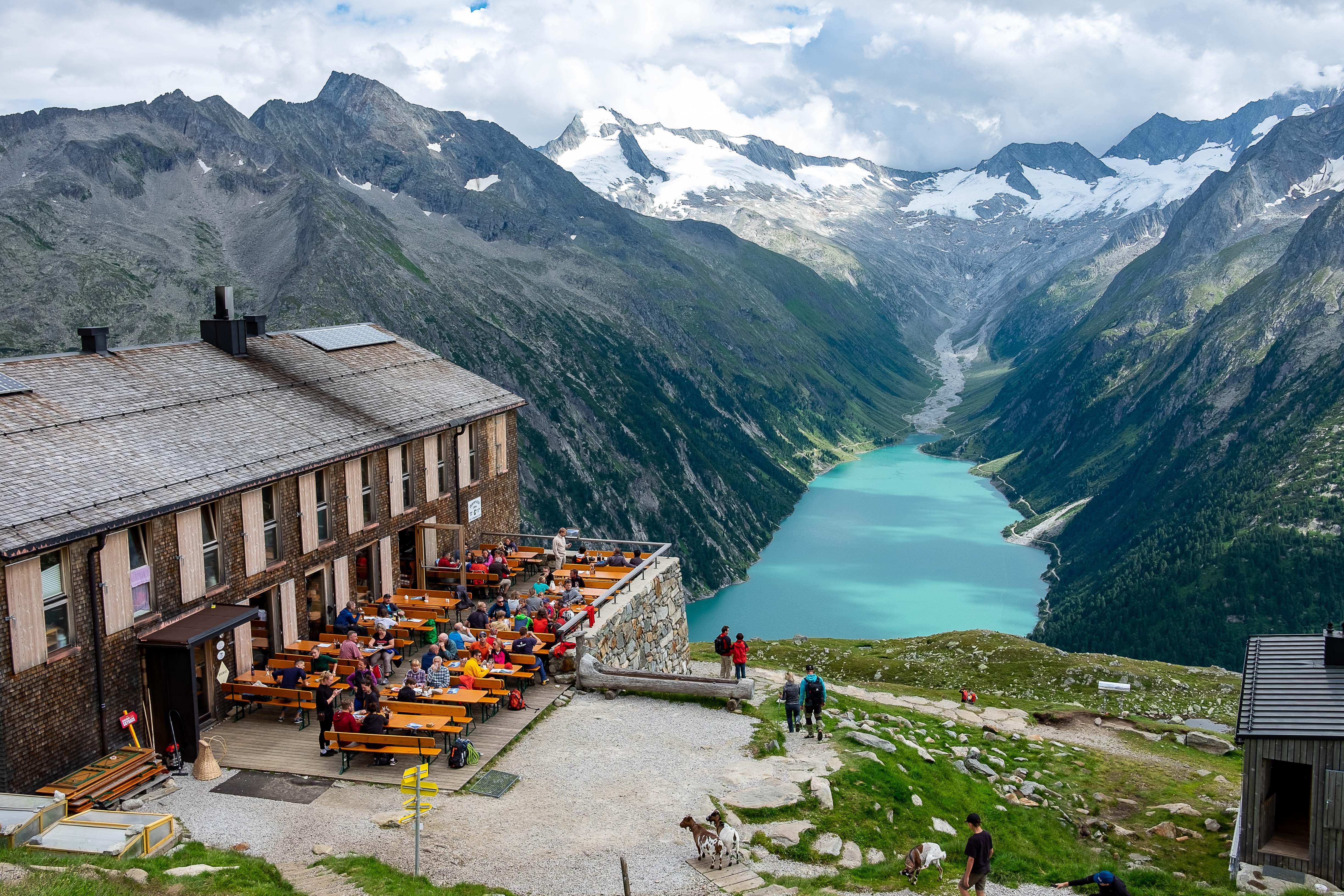 Aber das Beste kommt zum Schluss: der Blick von der Olperer Hütte über den Schlegeisspeichersee bis hin zum Großen Möseler und dem Schleigeiskees ist einfach nur überwältigend.